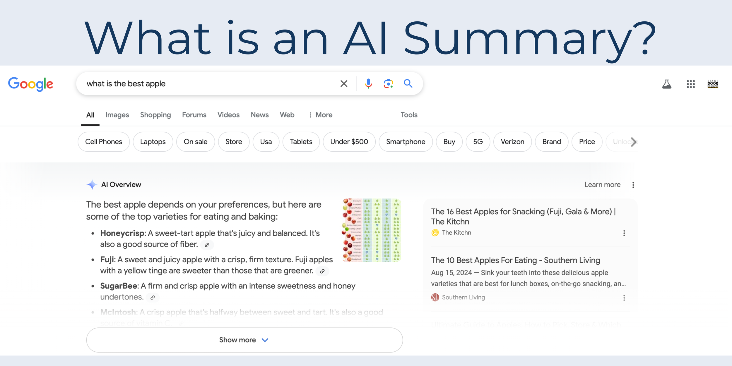AI Summary, or AI Overview is what appears at the top of a google search (see image). AI Summaries are created by AI bots screening the internet for relevant info, and compiling it for convenience.